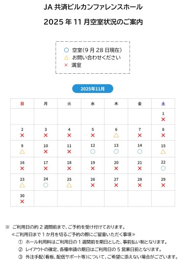 2025年11月 ホール空室状況のご案内(9月28日時点)