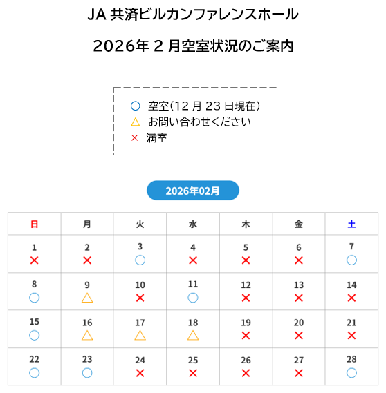 2026年2月 ホール空室状況のご案内(12月23日時点)